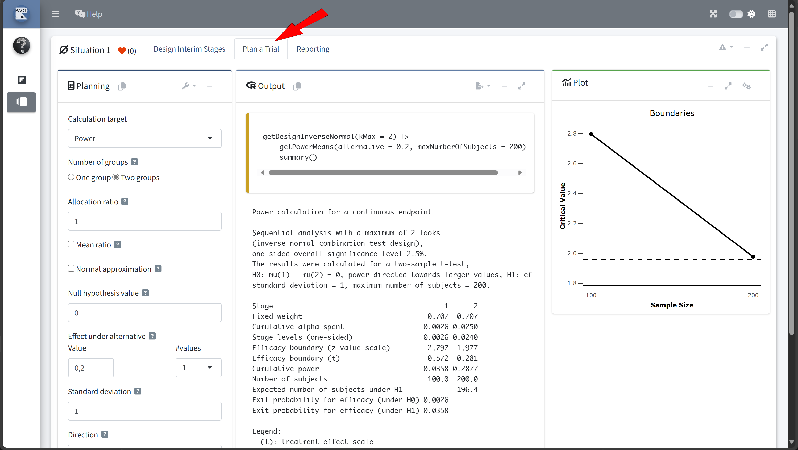 Using the rpact package, we can calculate the power of the study under the defined parameters. Here’s how: