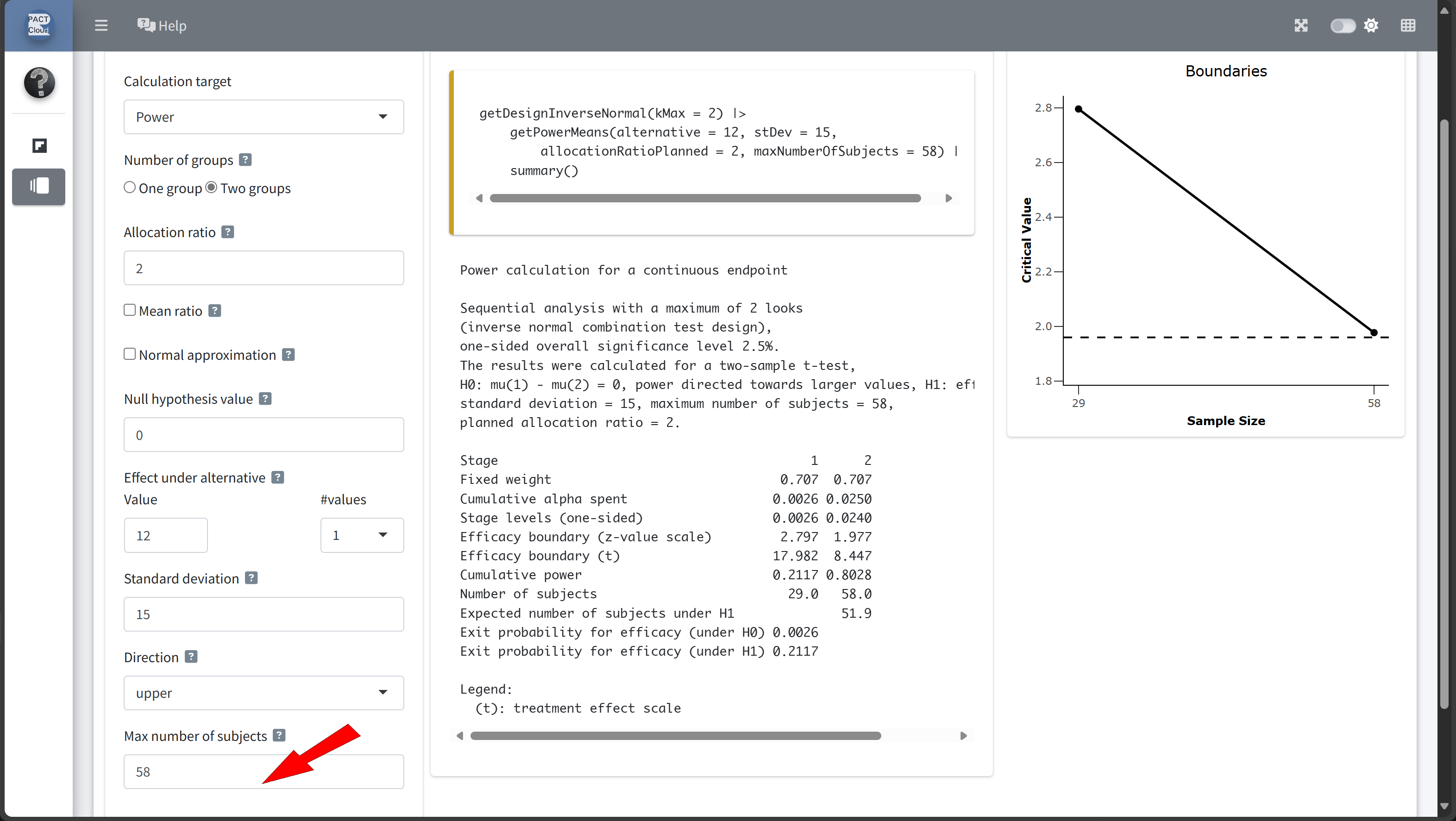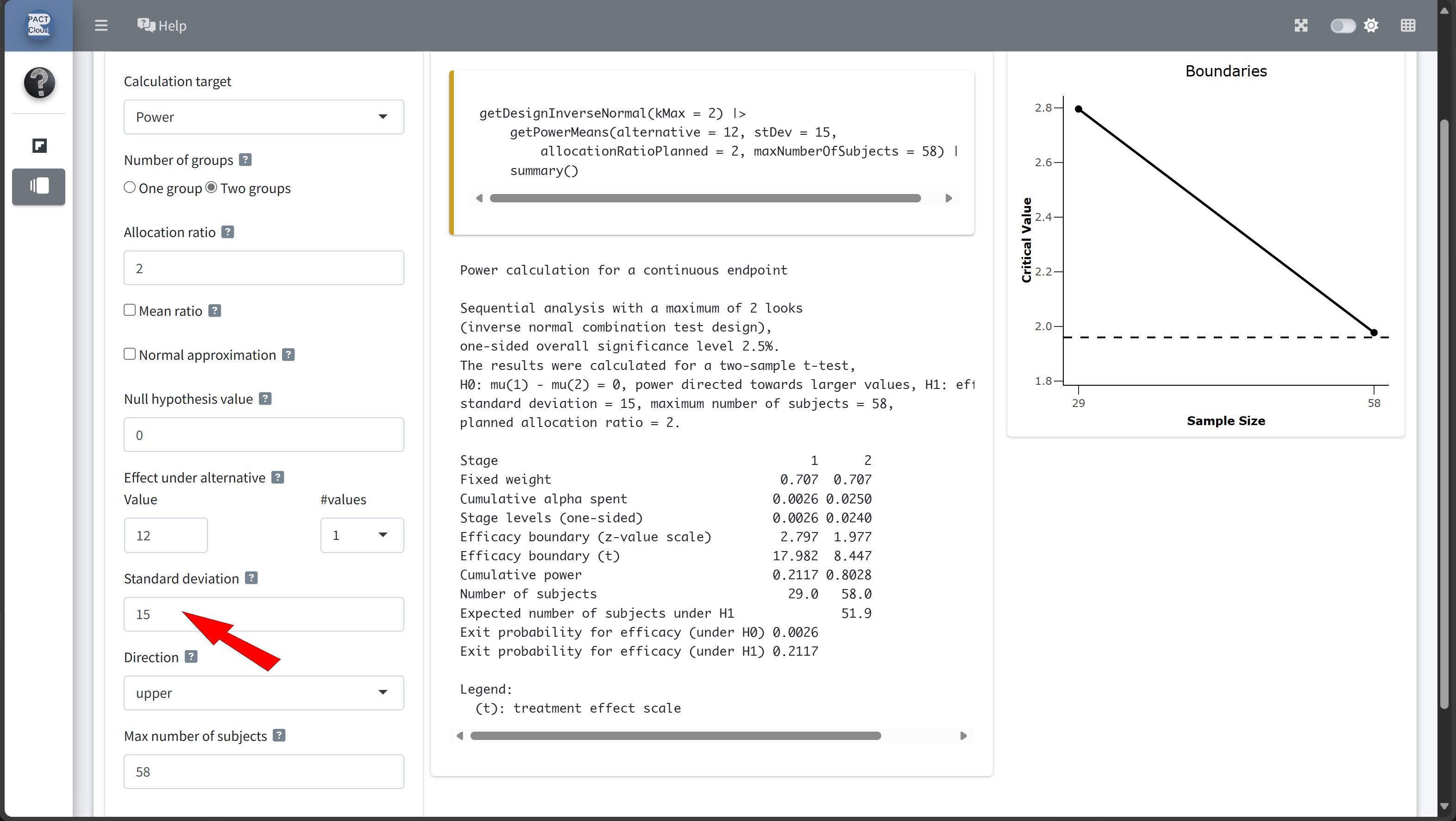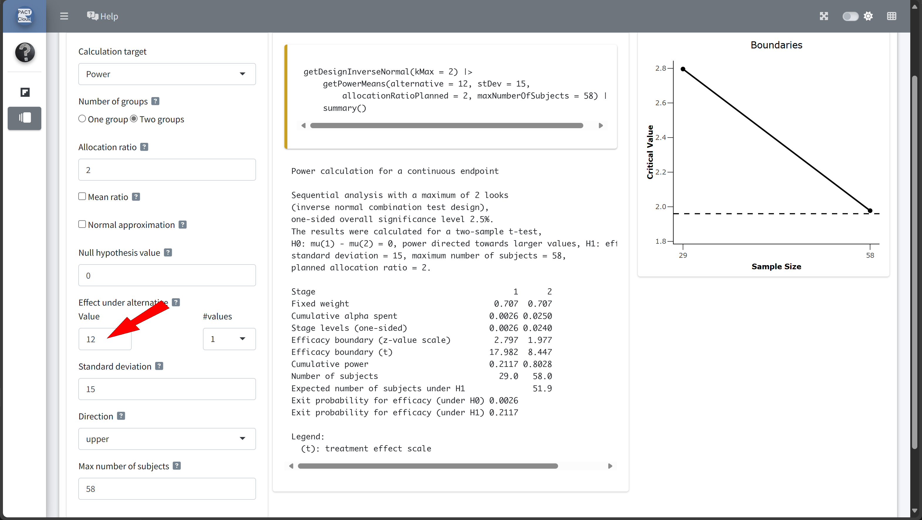 Sequential analysis with a maximum of 2 looks (group sequential design), one-sided overall significance level 2.5%. The results were calculated for a two-sample t-test, H0: mu(1) - mu(2) = 0, power directed towards larger values, H1: effect = 12, standard deviation = 15, maximum number of subjects = 59, planned allocation ratio = 2.