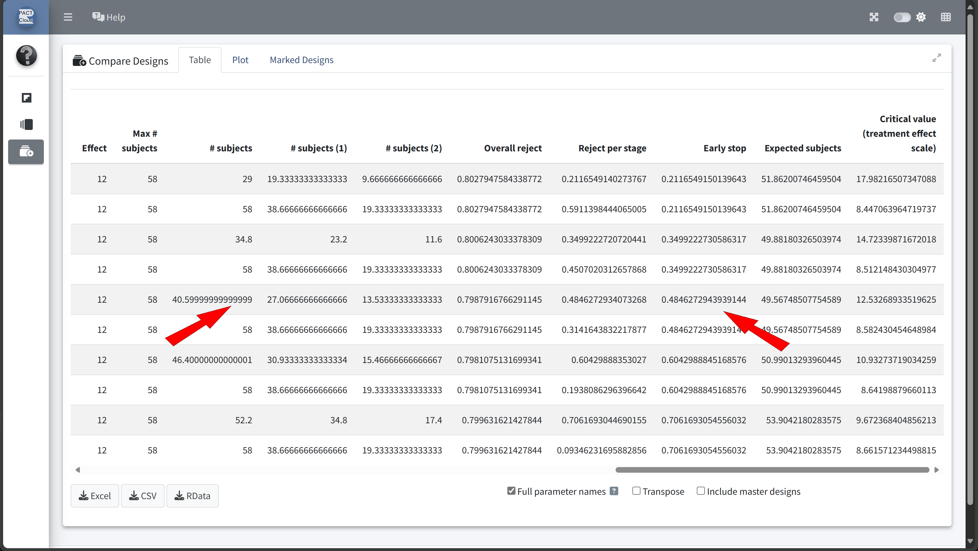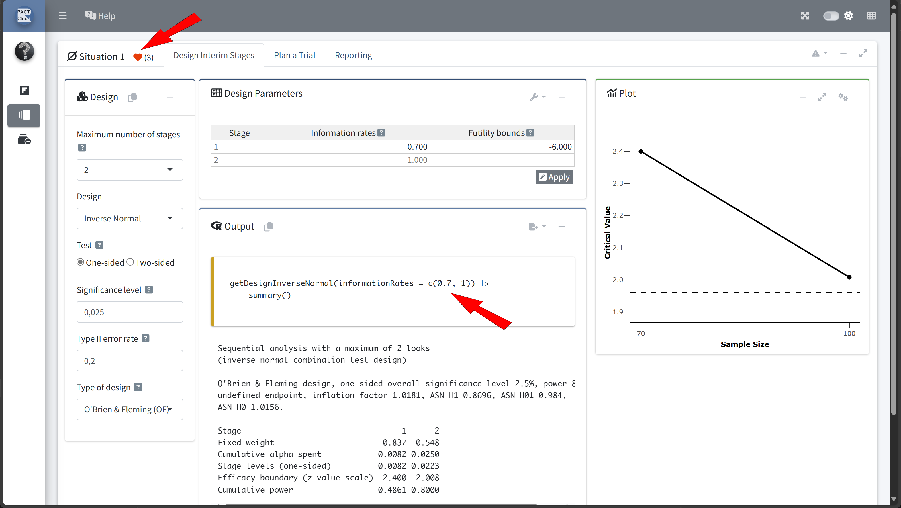 In this example we decide to use information rate 0.7 because the expected number of subjects is lowest and the probability for an early stopping is nearly 50%.